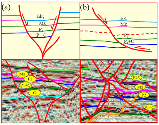 Strike-slip and thrust structures diagram. (a) Negative flower structures; (b) negative reverse Structure.