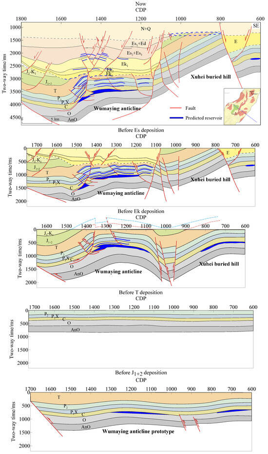 Based on seismic profile interpretation and structural evolution profiles, a typical structural genesis analysis was conducted. The Wumaying anticline originated in the Triassic period and experienced intense compression during the Early to Middle Jurassic and Late Jurassic to Early Cretaceous periods, further increasing the amplitude of fold uplift. The southern region of the anticline was significantly affected by deformation, leading to the development of thrust faults. This period primarily contributed to the formation of the Wumaying anticline, along with the development of the Wangguantun south anticline and the potential Xuhei anticline, as well as the emergence of thrust nappe belts. During the Cenozoic era, under the extensional environment of the Guantun anticline, the down-cutting of faults on both flanks formed buried hill structures. The Xuhei anticline, on the other hand, resulted from late-stage structural reverse faulting and folding, evolving into fault block buried hills through tilting and rotation. In the Cenozoic research area, under extensional forces, the eastern fault of Kongdian cuts down on both sides of the anticline, forming the Wangguantun buried hill structure. In a similar manner, the Xuhei buried hill also developed as an anticline during the Triassic-Early to Middle Jurassic-Early Cretaceous periods, undergoing structural inversion and fault down-cutting processes to evolve into a fault block buried hill.