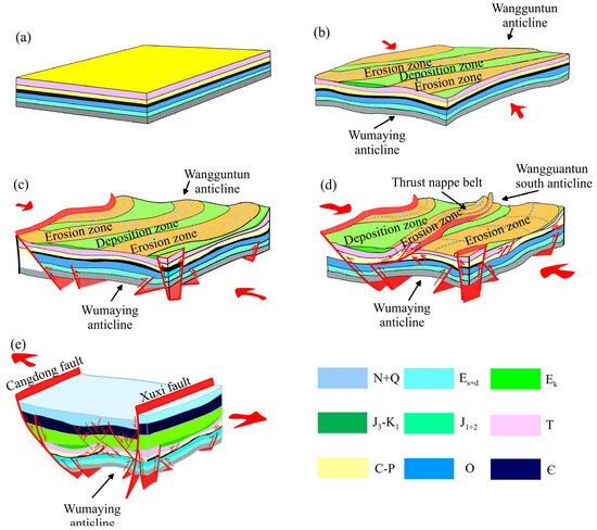 Tectonic evolution three-dimensional model diagram of the superimposed basin in the Kongnan area. (a) Craton basin. (b) Late Triassic (Indosinian period): stages of the formation of wide gentle slopes and anticlines. (c) Early Jurassic to Middle Jurassic (Early Yanshanian period): stages of imbricated thrust and backthrusting. (d) Late Cretaceous (Mid-Late Yanshanian period): stages of thrust fault detachment and nappe structures. (e) Cenozoic (Himalayan period): stages of shearing, strike-slip and extensional fault depression.