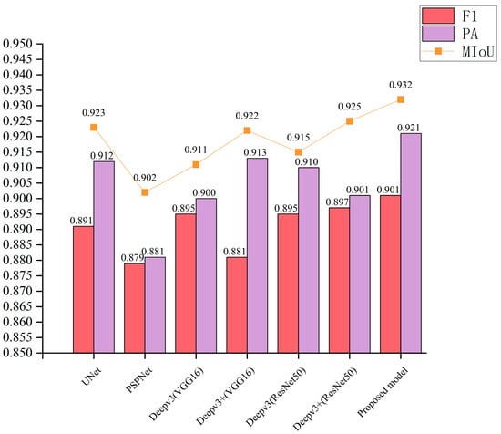 The system configuration consisted of an Intel 12th Gen Core™ i5-12400F processor, 3060 GPU, and 16 GB (8 GB × 2) of RAM. All comparison groups presented in this paper were trained using this machine with identical parameter settings, and all models were pre-trained on the ImageNet dataset to ensure the initial parameters were not excessively biased. The model was trained using Stochastic Gradient Descent (SGD) with a learning rate of 7 × 10−3, a minimum learning rate of (7 × 10−3) × 0.01, and a cosine learning rate decay. The training was carried out for 100 epochs, with a batch size of 4. The downsample_factor was set to 16, as a value of 8 was not feasible due to GPU memory limitations. The input image size was 512 × 512, and Weight decay was set to 1 × 10−4 to prevent overfitting.