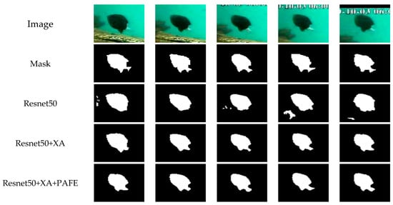 We use the ResNet50 backbone as the baseline to highlight the contribution of different modules. The first step was to evaluate how much the accuracy of the new network improved compared to the original model when various modules were added. The segmentation results after modifying the pyramid architecture and shape attention module in the network are presented in Table 3. The experimental results demonstrate that the pyramid feature extraction architecture improved segmentation accuracy by approximately 4% in underwater fish segmentation. Additionally, adding the shape attention module after the convolutional blocks of ResNet50 led to an improvement in detection accuracy.