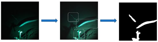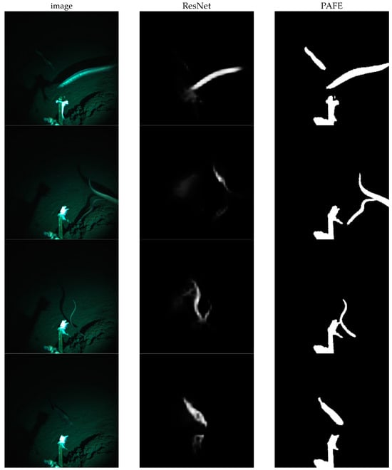 In deep-sea fish image segmentation, two main challenges arise: first, the fish shadow and the fish body are similar in shape; second, the RGB values of the bait and soil reflections are close to those of the fish body. To address these challenges, both the images and the model underwent further processing, as shown in Figure 9. During segmentation, the algorithm first optimizes the image by enhancing contrast and improving readability. The model then prioritizes color features, comparing them with the pre-trained model to identify key color values. This step filters out fish shadows and soil color blocks, focusing the attention on the fish itself. Next, the PAFE module uses optimized parameters to identify the fish’s shape features. Thanks to pre-training, the model performs secondary identification, directly detecting the fish and generating a segmented image. However, since the shape and reflective RGB values of the bait are similar to those of the fish, the bait is segmented alongside the fish. This is an area that requires further improvement in future research.
