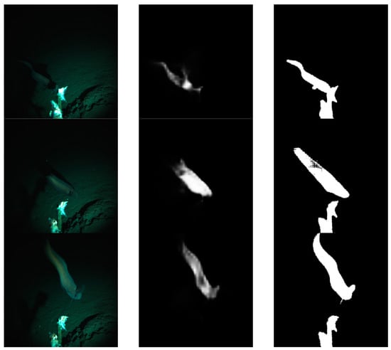 We constructed a real underwater image dataset consisting of over a hundred high-definition images captured at a depth of 3000 m using specialized underwater imaging equipment. The dataset includes underwater species such as fish, crabs, and shrimp, where the targets closely resemble the background. After preprocessing the images, segmentation experiments were conducted using various algorithms. The results show that classic neural networks, prior to any improvements, performed poorly in segmentation. However, the model proposed in this paper, inspired by camouflaged object segmentation techniques, optimizes the loss function and successfully segments the target to some extent. This approach presents a promising direction for future research regarding how to effectively segment fish in real-world environments. Figure 8 Model segmentation effect, the middle column represents the original model effect.