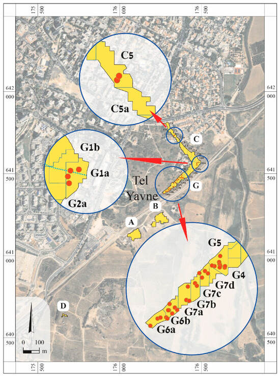 This study was conducted as part of the first phase of the “mega” salvage excavation project at Yavne, carried out between 2019 and 2021 (Permit Numbers: A-8520; A-8656) under the direction of Elie Haddad, Liat Nadav-Ziv, and Jon Seligman. The excavations focused on the eastern and southern fringes of the tel. Areas A and B, located approximately 400 m south of the tel (Figure 2), did not yield any BR finds. However, areas C1–C7, situated on the northeastern fringes of the tel, and areas G1–G8, located on its southeastern fringes, produced the majority of BR finds (Table 1). Area D, approximately 650 m southwest of areas A and B, was also excavated.