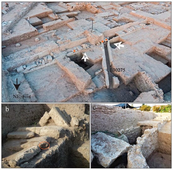 In the eastern part of the excavation, the tunnel diverged into an “excess tunnel” (L30275), measuring approximately 6 m in length and 0.56 m in width, with side walls about 0.7 m in height. This excess tunnel exits in a northeast direction (Figure 3c). The joint between the main tunnel and the excess tunnel was constructed as a single unit, indicating that both features belonged to the same operational phase.