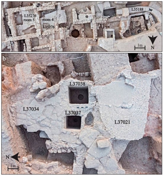 In two rooms (4 and 5, area G6a), a floor made of large BR plates was discovered (Figure 4a). In room 4, the floor dates to the end of the Byzantine period, and in room 5 the floor is dated to the Umayyad period. Beachrocks were also combined in a built winepress (Figure 4b) in area G7c, dated to Umayyad period. It is constructed of treading floor (L37021), and north of it is a working surface (L37034) paved with irregular BR plates (0.4 × 0.6 m average measure), with pair of square collecting vats (L37038, L37037).