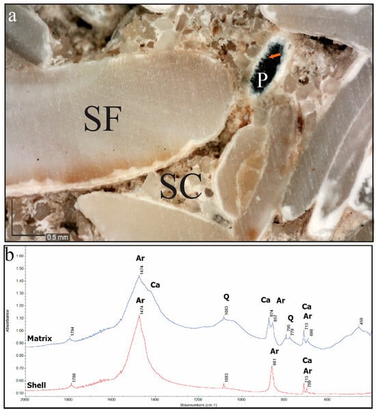 FTIR analysis enabled the identification of the main minerals present in a BR sample from a roofing plate in the tunnel (Figure 6b). These include aragonite, calcite, and quartz. Further FTIR analysis of a subsample taken from a shell fragment within a BR plate show that aragonite is the primary mineral in its composition.