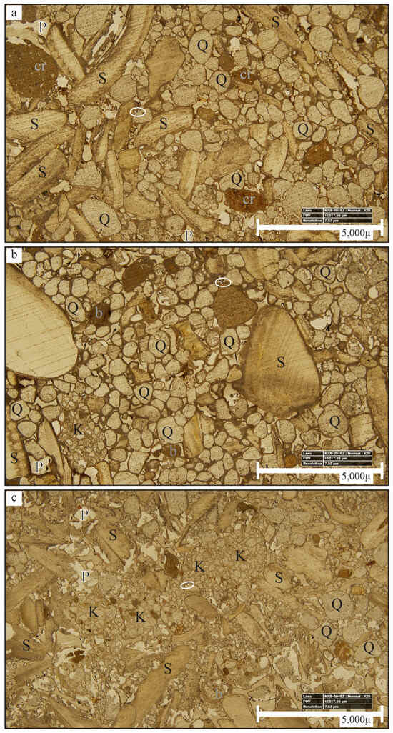 Micrographs of thin sections obtained from in-situ beachrock outcrop samples in southern Israel. All sections were captured under a digital microscope without polarization. Labels: S—Shell fragment; Q—Quartz grain; K—Kurkar fragment; P—Intergranular space; cr—Ceramic fragment; b—Undefined bioclast. (Micrographs: Cohen, M.) (a) Tel Ashkelon Beach: Moderately well-sorted beachrock composed primarily of elongated shell fragments. Also includes well-rounded quartz sand, ceramic fragments, and various undefined bioclasts. Cementation consists of microcrystalline calcite and acicular aragonite carbonate cements. Estimated porosity: ~5%. (b) Tel Ashkelon Beach: Well-sorted beachrock composed primarily of rounded quartz sand. Also contains shell fragments, well-rounded sand- to granule-sized aeolianite fragments, ceramic fragments, and finer undefined bioclasts. Cementation consists of microcrystalline calcite and acicular aragonite carbonate cements. Estimated porosity: ~5%; (c) Tel Yavne Yam Beach (south of Palmachim): Moderately sorted BR composed mainly of shell parts and also contains rounded sand- to granule-size aeolianite fragments and quartz sand and various finer undefined bioclasts cemented with microcrystalline calcite and acicular aragonite carbonate cements. The porosity level estimation is ~5%.