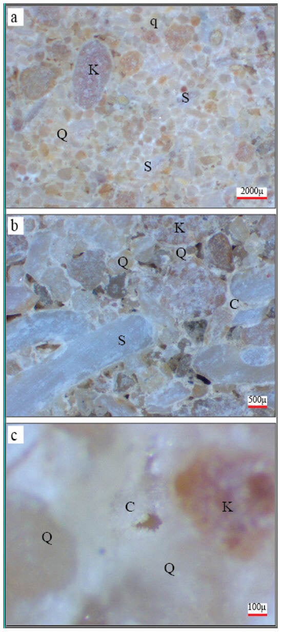 Micrographs of sections obtained from in-situ beachrock outcrop samples from Palmachim Beach: (a) moderately well-sorted beachrock composed of mixture of well-rounded quartz and fragmented kurkar sand and shell fragments (scale is 2000μ, PAL-4 in Table 2); (b) moderately sorted BR composed primarily of shell fragments and also contains well-rounded quartz sand and sand- to granule-sized rounded kurkar (PAL-3 in Table 2); (c) view of cements at intergranular pore between clasts (scale is 100μ PAL-4 in Table 2). Notes: S: shell fragment, Q: siliciclastic quartz grain, K: kurkar fragment, C: cement.