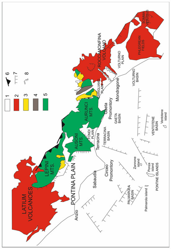 Geological map of the Campania Plain and tectonic lineaments occurring to a regional scale. Key. 1: Continental and marine deposits (Holocene–Late Pleistocene); 2: Volcanic deposits of the Campania–Latium region (Quaternary); 3: Arenaceous-clayey turbidites (Flysch di Frosinone Auct.; Tortonian–Messinian); 4: Shallow water organogenic limestones (Calcari a Briozoi e Litotamni; Langhian–Serravallian); 5: Shallow and deep water limestones (Latium–Abruzzi Unit; Jurassic–Cretaceous); 6: Thrust fronts; 7: Normal faults; 8: Caldera rims.