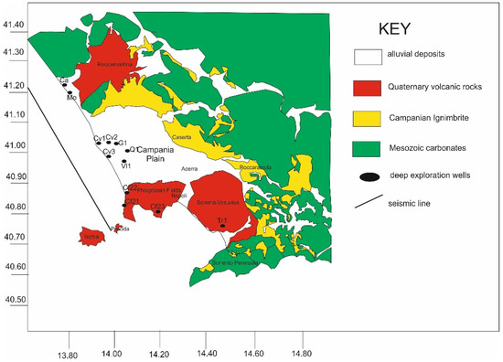 Sketch geological map of the Campania Plain, reporting the location of the seismic profile and exploration wells.