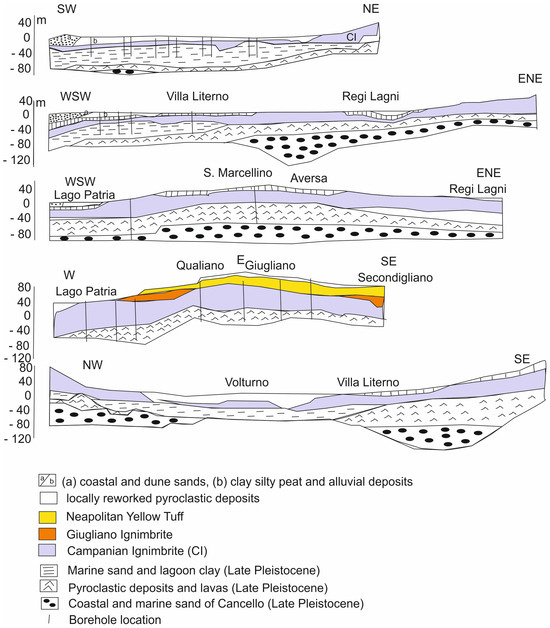 Geological sections of the CVZ (Campania Volcanic Zone; modified after Rolandi et al. [18]).