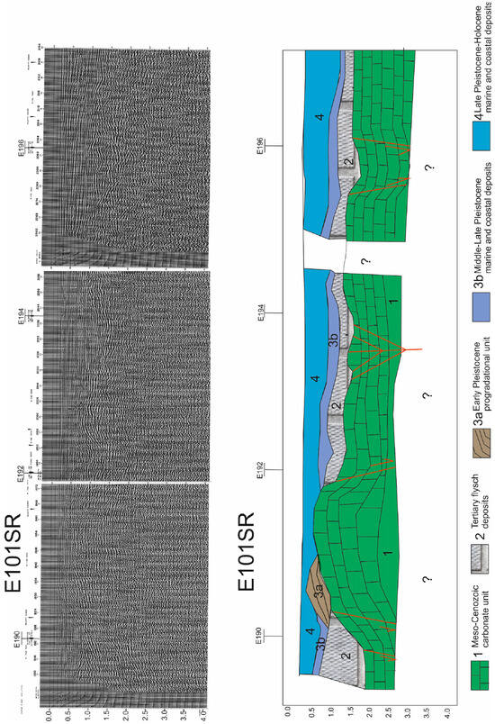 Some significant seismic profiles pertaining to the ViDEPI project [19] have been analyzed (Figure 6, Figure 7 and Figure 8). The seismic profile E101SR has shown seismo-stratigraphic units and fault trends down throwing the Meso–Cenozoic carbonates (Figure 6). The fault intersections have shown the offshore prolongation of the Massico Mt. structure. A horst has been identified, involving the seismo-stratigraphic unit correlated with the Meso–Cenozoic carbonate deposits (Figure 6 and Figure 7). Proceeding southwards, an anticline has been identified, interpreted as a positive flower structure (Figure 6). The seismo-stratigraphic 2 is characterized by discontinuous seismic reflectors and has been correlated with the Miocene flysch deposits (“Flysch di Frosinone” Auct.), outcropping in the adjacent onshore areas. An Early Pleistocene progradational unit has been recognized (unit 3a in Figure 6), representing the Volturno submerged fan. The seismo-stratigraphic unit 3b has been interpreted as Middle–Late Pleistocene marine and coastal deposits and is characterized by discontinuous and sub-parallel seismic reflectors (Figure 6), whilst the 4 one as Late Pleistocene–Holocene marine and coastal deposits.
