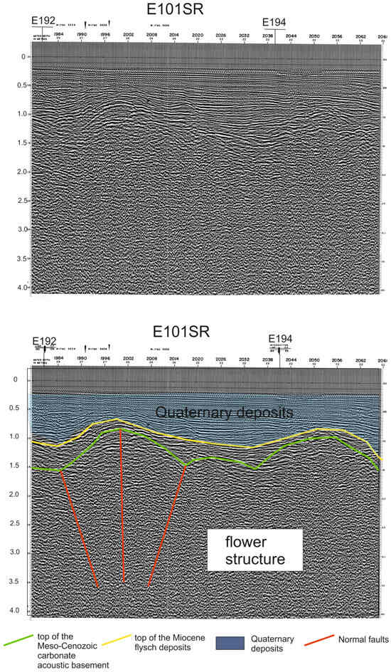 Details of the seismic profile E101SR and corresponding geological interpretation, showing the flower structures involving the top of the Meso–Cenozoic carbonate acoustic basement.