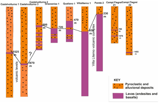 The Castelvolturno 1 and Castelvolturno 3 wells have revealed sedimentary layers that transition from marine to terrestrial environments, extending to a depth of 3000 m (see Figure 9). Within these sedimentary sequences, two volcanic strata have been identified, located at depths of 1430 and 1450 m in Castelvolturno 1 and between 1800 and 1830 m in Castelvolturno 3.
