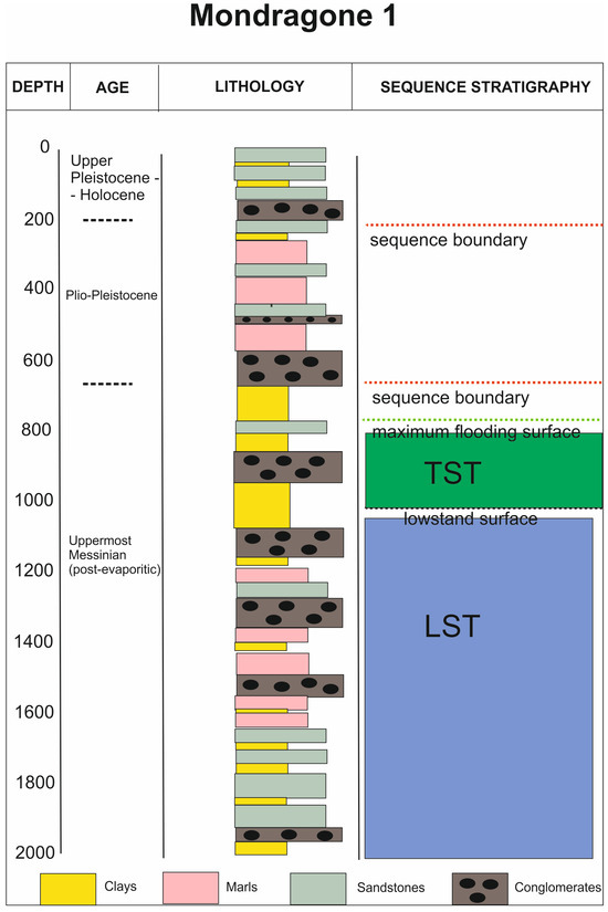 Stratigraphic correlation of the Mondragone 1 well (modified after Cosentino et al. [44]).