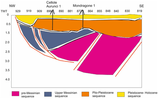 It is also important to consider in the calibration of the seismic section is the lithostratigraphic data from Mondragone 1 well. These lithostratigraphic data are crucial for the geological interpretation of the deep seismo-stratigraphic units, respectively related to the Miocene flysch deposits and to the Meso–Cenozoic carbonate acoustic basement. The Mondragone 1 well was drilled to a depth of 675 m, penetrating Quaternary deposits consisting primarily of sandy materials with volcanic components and conglomerates mixed with layers of marls (Figure 10) [44]. At depths shallower than 675 m, the well has penetrated Miocene formations, which consist of conglomerates, sandstones, and marly sandstones (Figure 10). These successions have been interpreted as post-evaporitic and interpreted in the context of the late Messinian Lago–Mare episode in the central Mediterranean Sea (Figure 10).