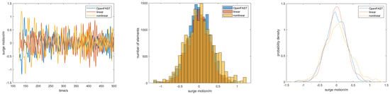 In the random case analyzed, the significant wave height is measured at 15 m, with a wave period of 14 s. The random wind generated by TurbSIM v2 [27] has an average speed of 18 m/s. The results are presented in Figure 9. We chose to conduct the random case first, as it holds greater significance in real-world scenarios. It is evident that the range of responses is larger in nonlinear situations. The surge direction response remains relatively unchanged compared to the other directions due to the mooring system. As external random loads increase, the heave response becomes larger, and the pitch angle tilts more in the load direction, which is expected. However, such phenomena are not identifiable in linear modes. We also performed a frequency domain analysis, as completed previously, to determine if there were any notable frequencies that might impact our platforms. In our case, we did not observe any. However, other notable frequencies could arise in other scenarios, contingent on the relevant design factors of the system.
