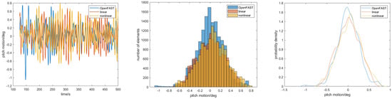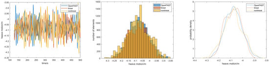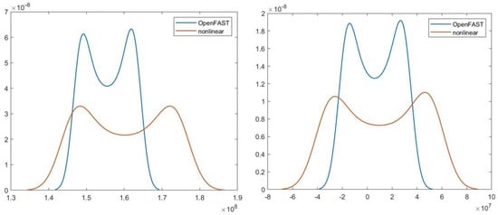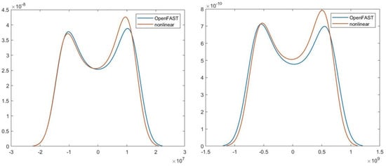The nonlinearity arises from both the Froude–Krylov force and the restoring force. To assess which of these forces plays a more significant role in the overall nonlinear behavior, we conducted a probability density estimate; using a normal kernel function helps to estimate the probability distribution of a set of data points. This method is part of the Kernel Density Estimation (KDE), which is a way to estimate the probability density function (PDF) of a random variable without making specific assumptions about the data. In this method, a normal distribution, also known as a Gaussian kernel, is placed at each data point. These normal distributions are then added together to create a smooth estimate of the overall distribution. The results of this analysis are presented in Figure 11 and Figure 12.