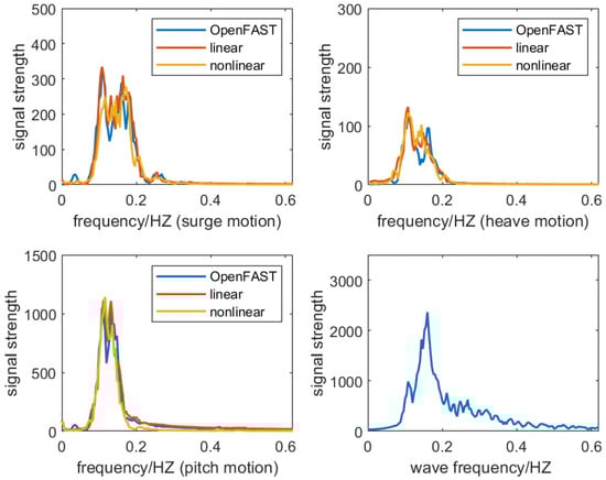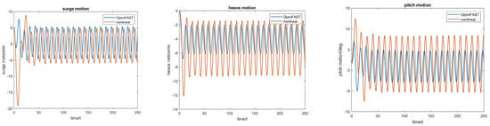 From the above analyzed cases, we observe that, when platform motion is minimal, there is no significant difference between the results generated by OpenFAST and the linear and nonlinear modules of SIMYDYN-OpenFAST. This observation aligns with our previous research on response analysis in ships [21], barges [22], and wave energy converters [23]. These figures highlight the accuracy of our program and validate the consistency between OpenFAST and the linear module of SIMYDYN-OpenFAST. Furthermore, it indicates that, when wave loads remain within normal ranges, nonlinear forces do not significantly impact the calculations due to the relatively small variations in instantaneous positions. Since the sway, roll, and yaw responses are so small, they will not be discussed in this paper.
