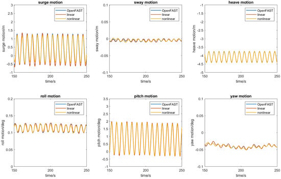 To illustrate our findings clearly, we also perform a regular case study; the results are shown in Figure 8. The responses in six directions are very closed, especially the results from OpenFAST and the linear module of SIMDYN-OpenFAST, and there are some ‘coupled errors’, which are very small and can be ignored. The nonlinear module differs slightly from other results due to the different calculation theories, which we explained in Section 2.