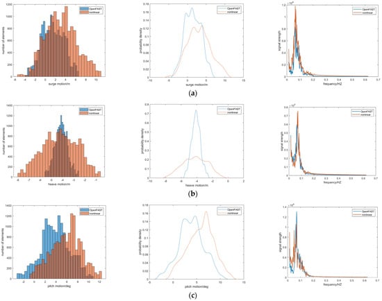 A comparison of the results of OpenFAST and OpenFAST coupled with SIMDYN. (a) Responses in surge direction. (b) Responses in heave direction. (c) Responses in pitch direction.