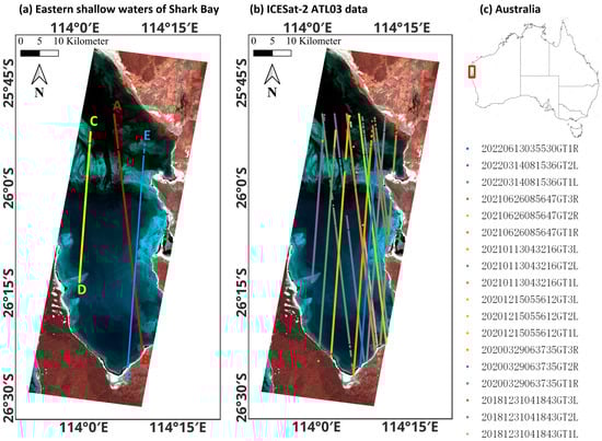 Shark Bay in Australia consists of two elongated bays, the chosen part of which is the eastern bay, about 85 km (north–south) and 30 km (east–west). It covers an area of approximately 1725 km2, with geographical coordinates ranging from 113°56′ E to 114°14′ E (longitude), and 25°40′ S to 26°30′ S (latitude). The clear water quality of this area is listed on the World Heritage List and has the largest seagrass habitat environment in the world []. Therefore, it is the most ideal area for bathymetry inversion. Figure 1a shows the study area, using the RGB base map generated by EnMAP images. The displayed RGB channels are bands 45, 21, and 12 of EnMAP (see Table 1), respectively. In Figure 1a, line segments AB, CD, and EF represent the trajectories of ICESat-2 on 20210626GT1R, 20201215GT3L, and 20220613GT1R, respectively. These trajectories are utilized for method comparison and result analysis in the subsequent sections of the paper. In Figure 1b, solid lines of different colors represent different trajectories of ATLAS laser scanning, with 18 ICESat-2 strip data information on the right side. Figure 1c shows the location of Shark Bay in Western Australia.