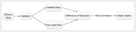 Previous studies [,] used DBSCAN to cluster and hierarchize photons on the water surface and underwater bottom. If the study area is small, this method is a simple and effective density clustering method. However, the research area is about 1700 km2, and the 17 photon trajectories involved include noise data and valid data, with a data volume of up to millions. If this method is applied with limited hardware resources, it would require a substantial amount of time. Additionally, if the study area is in extremely shallow waters with poor water quality, it becomes challenging for this method to distinguish between photons from the water surface and those from the seafloor. Therefore, it is evidently time consuming and labor intensive to use this method for mapping in situ water depth points over a large area. The ground trajectory formed by the ATLAS laser pulse actually forms a section perpendicular to the ground. On the tangential surface, the sea level is a straight line, the seabed is a polyline, and other points are noise data. Therefore, this study considers reducing the dimensionality of photon data in three-dimensional space to lines on a two-dimensional plane. Water depth data processing, as shown in Figure 2, includes the following steps: (1) Use the RANSAC [,] method to cluster ATL03 data and fit them into a straight line model, and then extract the sea surface straight lines and seabed polylines, respectively. Other scattered points are noise data and are directly removed. (2) Use the elevation difference between the seafloor polyline and the sea surface straight line to obtain uncorrected bathymetry data. (3) Calculate the bathymetry data corrected by seawater refraction based on the laser pulse incident angle (ref_elev) of different photon trajectories and the refractive index of seawater (1.34116). (4) Consult the tide table of the study area [] to calculate the tide-corrected bathymetry data. This method is suitable for ATL03 data processing of large areas of water. When the data volume of effective laser points is large enough, even a slight loss of bathymetry points on the section can be ignored.