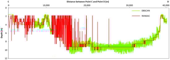Comparative analysis of DBSCAN and RANSAC methods for extracting water depth values (red line represents water depth values extracted by RANSAC, green line represents bathymetry values extracted by DBSCAN.).