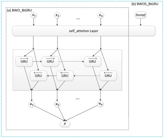 Band weight-optimized algorithm. (a) BWO_BiGRU module; (b) BWOS_BiGRU module.