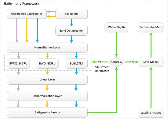 In the previous work, the authors have proposed the Band-Optimized Bidirectional LSTM (BoBiLSTM) model [] and Attention-based Band Optimization CNN (ABO-CNN) model [] to improve the accuracy of bathymetry inversion through band screening and band optimization. However, for large-area bathymetry inversion from satellite images, the band screening work of the BoBiLSTM model is particularly complicated. It is necessary to observe the missing bands of multiple images in order to determine which important bands to select. The bathymetry prediction accuracy of the ABO-CNN model in multispectral images is slightly lower, and the estimated water depth is prone to be slightly deeper in extremely shallow-water areas. In response to the above problems, a new model—Band Weight-Optimized Bidirectional Gated Recurrent Unit (BWO_BiGRU)—is proposed based on the characteristics of hyperspectral satellite images with a large number of bands and narrow spectral range. By adding the characteristic information of the Stumpf model, the Band Weight-Optimized and Stumpf’s Bidirectional Gated Recurrent Unit (BWOS_BiGRU) model is also proposed for less bands and wider spectrum ranges of multispectral satellite images. The BWO_BiGRU model uses two algorithms, namely a self-attention mechanism and a two-layer bidirectional GRU model. The self-attention mechanism is a special attention mechanism that can focus on the correlation between the satellite image’s neighboring pixels and assign different weight information to different bands by establishing a connection with water depth data. The logic unit of the BiGRU model reduces a gate control structure and is more lightweight than the BiLSTM model. Therefore, the model takes less time during the training process and is easier to converge, making it suitable for mapping large-area bathymetry. The BWOS_BiGRU model uses the above two methods and adds the band ratio of the Stumpf model in the input stage as an extra important feature that affects bathymetry inversion. This method can further enhance the bathymetry inversion of shallow-water areas for multispectral image data. The study site selected for the experiment is the eastern bay of Shark Bay, Western Australia. The research contributions of this paper are as follows: (1) Two bathymetry inversion models, BWO_BiGRU and BWOS_BiGRU, were proposed for hyperspectral and multispectral satellite images, respectively. Both models yielded bathymetry maps superior to the traditional Stumpf model. (2) It is proved that using the RANSAC method to extract ICESat-2 depth points is an efficient way for mapping large-area bathymetry from satellite images.