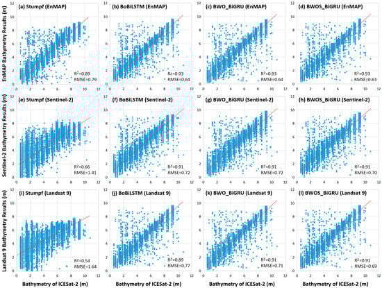 (a–l) Comparison of bathymetry accuracy of different models applied to different satellite images.