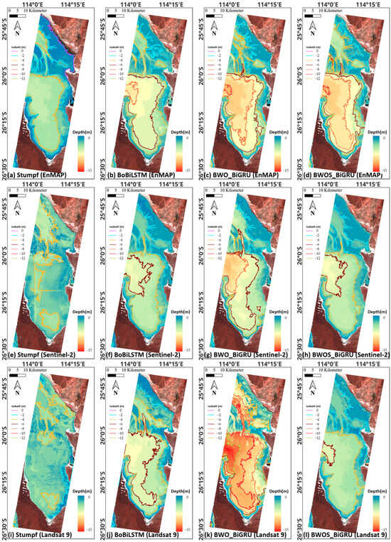 The bathymetry inversion maps generated by different models using EnMAP, Sentinel-2, and Landsat 9 images are shown in Figure 7. The isobaths of different bathymetry inversion maps are spaced at 2 m intervals and relatively smooth. The Stumpf model demonstrates a bathymetry inversion range of 0 to 7 m on the EnMAP image (Figure 7a), exhibiting a good bathymetry texture. However, the water depth in deep areas is underestimated. On the Sentinel-2 image (Figure 7e), a bathymetry inversion range of this model is 0 to 15 m, with water depths exceeding 10 m in the transition zone between deep and shallow areas. The texture transition in bathymetry inversion also appears relatively coarse. The bathymetry inversion range of this model on the Landsat 9 image (Figure 7i) is 0 to 6 m, with the bathymetry texture showing deeper water in shallow areas and shallower water in deep areas. The BoBiLSTM model exhibits a bathymetry inversion range of 0 to 15 m on the EnMAP image (Figure 7b). The bathymetry transition between shallow and deep areas appears relatively smooth, but the model tends to predict shallower-water depths in areas with depths exceeding 7 m. On the Sentinel-2 image (Figure 7f) and Landsat 9 image (Figure 7j), the bathymetry inversion range of this model is both 0 to 8 m. In both cases, there is a tendency to underestimate water depths in deep areas exceeding 6 m, with the Landsat 9 image showing cases of overestimation in the nearshore shallow-water areas. The BWO_BiGRU model (Figure 7c) and BWOS_BiGRU model (Figure 7d) both demonstrate a bathymetry inversion range of 0 to 13 m on the EnMAP image. The bathymetry texture exhibits smooth transitions, whether in shallow or deep areas, and the fluctuations in water depth appear natural. The bathymetry inversion performance of these two models on the EnMAP image is superior to that of the Stumpf model (Figure 7a) and BoBiLSTM model (Figure 7b). On the Sentinel-2 image, the BWO_BiGRU model (Figure 7g) exhibits a bathymetry inversion range of 0 to 11 m, with a tendency to underestimate water depths in deep areas. Meanwhile, the bathymetry inversion range of the BWOS_BiGRU model (Figure 7h) is 0 to 8 m, underestimating areas with water depths greater than 7 m. The bathymetry inversion performance of the BWOS_BiGRU model is slightly lower than that of the BWO_BiGRU model (Figure 7g). On the Landsat 9 image, the BWO_BiGRU model (Figure 7k) shows a bathymetry inversion range of 0 to 15 m, significantly overestimating water depths in deep areas and underestimating water depths in shallow areas. In contrast, the BWOS_BiGRU model (Figure 7l) exhibits a bathymetry inversion range of 0 to 13 m, with a tendency to underestimate water depths in deep areas. In summary, the models that demonstrate superior performance in bathymetry inversion using EnMAP imagery are the BWO_BiGRU and BWOS_BiGRU models. For bathymetry inversion using Sentinel-2 imagery, the BWO_BiGRU model stands out. When it comes to bathymetry inversion using Landsat 9 imagery, the BWOS_BiGRU model excels in shallow-water areas, while the BoBiLSTM model performs well in deep-water areas. It is noteworthy that the performance of bathymetry inversion using EnMAP imagery is consistently better than that achieved with Sentinel-2 and Landsat 9 imagery.