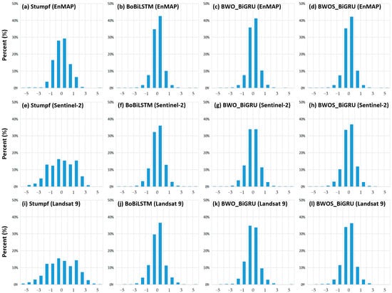 Figure 8 presents the residual maps of different models using various satellite images for bathymetry inversion. For the BoBiLSTM, BWO_BiGRU, and BWOS_BiGRU models, over 90% of the residual distribution for predicted bathymetry points is concentrated within 1 m. Among them, the performance of EnMAP imagery surpasses that of Sentinel-2 and Landsat 9 imagery. In EnMAP imagery, the Stumpf model exhibits 85% of the residuals distributed within 1 m, while its performance is less favorable in Sentinel-2 and Landsat 9 imagery, with less than 60% of residuals distributed within 1 m. Therefore, combining deep learning models with hyperspectral satellite imagery enhances the accuracy of bathymetry inversion.