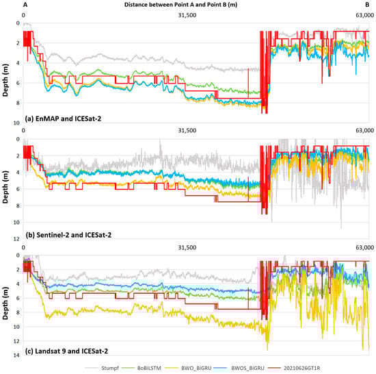 This study selected the bathymetry data from two ATL03 data (20210626GT1R and 20201215GT3L) for the study area and compared the bathymetry profiles predicted by different models, as shown in Figure 9. The 20210626GT1R track data cover approximately 63 km, while the 20201215GT3L track data cover around 40 km. Both datasets encompass shallow and deep-water regions. Through comparative analysis, it can be observed that the depth range predicted by the Stumpf model in the three types of imagery is around 5 m. In the EnMAP case, the bathymetry profiles of all deep learning models are fitted near the ATL03 data. Among them, the BWO_BiGRU model (Figure 9a) and BWOS_BiGRU model (Figure 9d) provide more accurate predictions for deep-water regions. In the Sentinel-2 case, the water depth profiles of all deep learning models (Figure 9b,e) closely match the ATL03 data in shallow water areas, with the BWO_BiGRU model providing a slightly better fit in deep-water regions. In the Landsat 9 case (Figure 9c,f), the bathymetry profile of the BoBiLSTM model can only predict depths of around 6 m in deep-water areas, but it predicts deeper depths in shallow-water areas. The bathymetry profile of the BWO_BiGRU model is deeper, while the profile of the BWOS_BiGRU model fits well in shallow-water areas but is slightly shallower in deep-water regions. Comparing the bathymetry profiles generated from different images, it is evident that the transition of bathymetry textures in both shallow and deep-water areas is superior in EnMAP imagery compared to Sentinel-2 and Landsat 9.