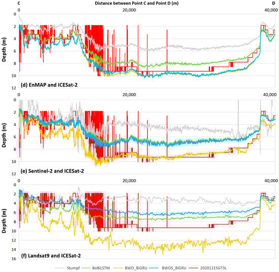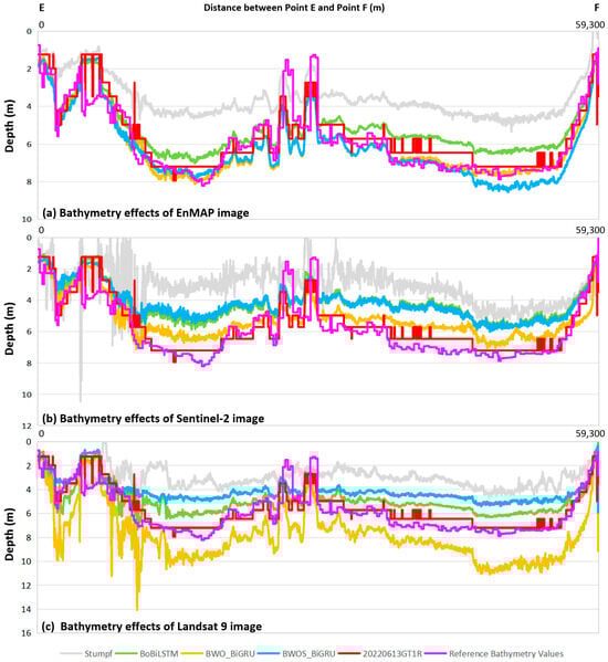 To analyze the bathymetry inversion effects of different satellite images, comparisons were made among different models based on their RMSE across various water depth intervals, as depicted in Table 6. In model training and testing, we used fewer than 50,000 ICESat-2 bathymetry points, of which only 29 points had a depth greater than 10 m, accounting for approximately 0.06% of the data. As a result, deep learning models exhibited significant errors when predicting water depths above this threshold, with an RMSE value exceeding 4 m. This indicates that the performance of deep learning models in bathymetry inversion is poor when the dataset is insufficient. In contrast, the Stumpf model, being a linear model, shows lower errors with an RMSE of 2.78 m. This implies that all models have limited accuracy in predicting water depths exceeding 10 m. When using EnMAP imagery, the BWO_BiGRU model and the BWOS_BiGRU model perform best within the water depth interval of 6 to 8 m, with RMSE values around 0.45 m. The second-best performance is observed in the interval of 4 to 6 m, with RMSE values around 0.6 m. The third-best performance is in the intervals of 2 to 4 m and 8 to 10 m, with RMSE values around 0.7 m. The least accurate predictions are in the shallow-water range of 0 to 2 m, with RMSE values around 0.8 m. This is also consistent with the actual ICESat-2 data collected, where the majority of bathymetry points are concentrated within the range of 2 to 10 m. The more data points there are within each water depth interval, the more feature importance the deep learning model learns, resulting in smaller RMSE values. When using Sentinel-2 and Landsat 9 imagery, the BWO_BiGRU model and the BWOS_BiGRU model exhibit slightly increased RMSE values across different water depth intervals compared to EnMAP imagery. The BoBiLSTM model generally shows higher RMSE values across various water depth intervals compared to the BWO_BiGRU and BWOS_BiGRU models. The Stumpf model performs the worst, with RMSE values exceeding 2 m in the 0 to 2 m water depth interval.