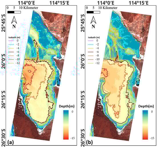 Bathymetry maps with different resolutions. (a) DEM data for Shark Bay; (b) the bathymetry map generated by the BWO_BiGRU model and EnMAP image.