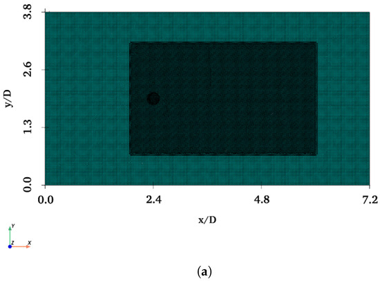 This study is divided into four stages for each . At Stage 1, a finite cylinder (FC) with a diameter of 0.24 and a draft of 0.48 is considered. Stage 2 considers a finite cylinder with a heave plate (FCHP) with a diameter of 0.48 and a thickness of 0.12 . In Stage 3, there are three cylinders with heave plates (TCHP) in an equilateral arrangement, and in Stage 4, the OC4 semi-submersible platform (OC4) is considered (Figure 3). The diameter and draft of cylinders of TCHP and OC4 are kept at 0.24 and 0.48 , respectively. This ensures that the aspect ratio ( = draft of cylinder (L)/diameter of cylinder (D)) is fixed at 2 throughout the study for all structures, and the OC4 is scaled as 1:50 of the original model, as in the case of Goupee et al. [39]. Computer-aided drawing (CAD) models of FC, FCHP, TCHP, and OC4 are prepared using SALOME, an open-source software for CAD, meshing, visualisation, etc. These CAD drawings are then imported to OpenFOAM V10 for simulation [40]. The domain size in streamwise, cross-stream, and vertical directions for all structures is summarised in Table 1. To ensure that side wall effects are minimal, the length of the domain is kept slightly larger than the one used by Alkishriwi et al. [41]. A larger domain in the streamwise direction is used for TCHP and OC4 as these structures have multiple members spread apart, covering a larger plan area. The meshes for the simulations are generated using OpenFOAM’s blockMesh, refineMesh, and snappyHexMesh facilities. To capture the flow separation in the wake of the structures, the mesh is refined locally, and the aspect ratio is kept close to 1. Figure 4, Figure 5, Figure 6 and Figure 7 show the plan views from the top profile view at of the computational meshes for the four structures. A refined area has been added around the structure to capture the wake.