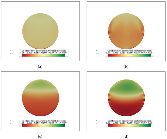 Streamwise pressure coefficient acting on FC (a), FCHP (b), TCHP (c), and OC4 (d) at = 200,000. The front surface of cylinders and heave plates can be divided into three zones: the green zone in the middle where the pressure is maximum; the red zones on either side where the pressure is minimum; the transition zone in between. The variation of pressure on the surface of the heave plate is due to separation of incoming flow.