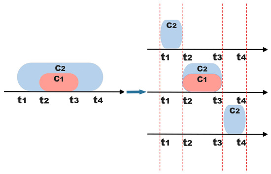 Behavior pattern association and combination diagram. In this case, the interval timestamps of behaviors C1 and C2 partially overlap. Between timestamps t1 and t2, C2 precedes C1; between t2 and t3, C1 and C2 occur concurrently; and between t3 and t4, C2 follows C1.