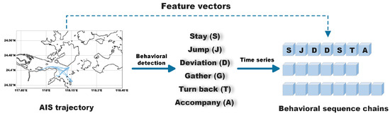 Through the BPEF mining model in Section 2.1 of this paper, we mine all behavior patterns of the target vessel and known anomalous vessels, converting them into corresponding behavior symbols as described in Section 2.2.1. Then, based on the temporal sequence combination of vessel behavior patterns, all behavior pattern symbols are sorted by occurrence time, and the feature vectors of each behavior pattern are similarly ordered, ultimately forming a vessel behavior sequence chain with associated feature vectors. The specific construction process of the ship behavior sequence chain is shown in Figure 3.