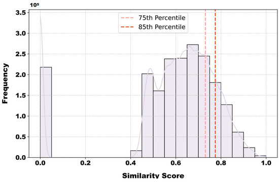 Using the known anomalous ship behavior data in the training dataset, we first calculated the similarity distribution of ship behaviors among anomalous ships. Figure 8 illustrates that the similarity scores of anomalous ships are primarily distributed between 0.4 and 0.9, indicating a notable degree of behavioral similarity among anomalous ships. According to the similarity scores, a range of potential thresholds was established to balance detection accuracy and false positive rates. Here, we set the initial threshold as the 75th and 85th percentiles based on the statistical results, as these quantiles effectively represent the majority of anomalous behavior characteristics, ensuring both the sensitivity and precision of the model.