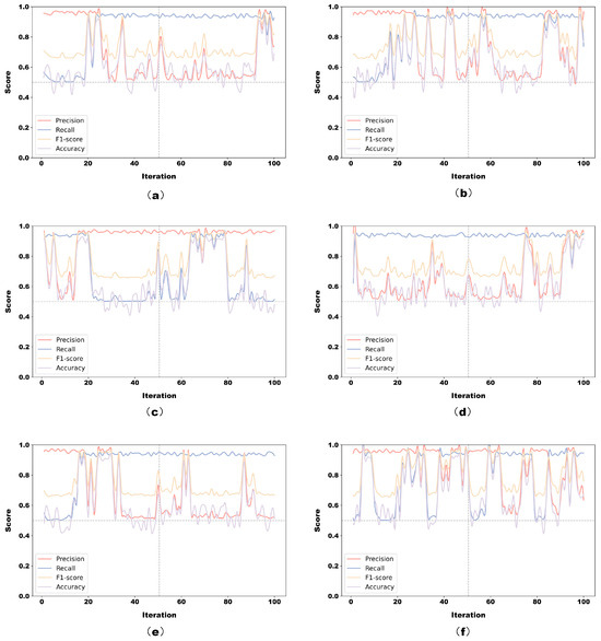 Performance of six combinations during iterations. Including precision, recall, F1-score, and accuracy. (a–f) represents specific combinations of weight parameters (A, B, C) and initial thresholds, as detailed in the combinations shown in Figure 9. The x-axis depicts the number of iterations, while the y-axis represents the values of precision, recall, F1-score, and accuracy. These performance metrics provide insights into the stability and convergence trends across different parameter configurations.
