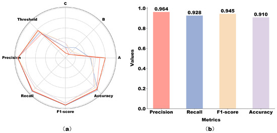Figure 12a presents a radar chart comparing the optimal parameter combinations from six experiments conducted on the training dataset. The results indicate that the model maintains high recall and precision across different parameter configurations, with stable detection outcomes. Based on the optimization results from the training dataset, we set the weight parameters to 0.6, 0.2, and 0.2, and the threshold to 0.75. We then validated the model using the Xiamen Port test dataset. As shown in Figure 12b, the BPEF-TSD demonstrates outstanding performance across four metrics: precision, recall, F1-score, and accuracy. Specifically, the model achieves a precision of 0.964, a recall of 0.928, an F1-score of 0.945, and an accuracy of 0.910.