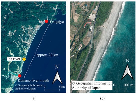 Location of the study site: (a) position of the Shichiri-Mihama coast; (b) estuary of Ida River.