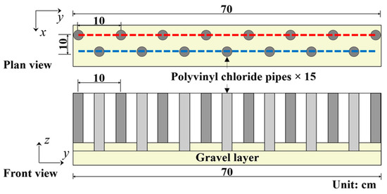 Accelerated landward deposition of gravel significantly contributes to river mouth closures and reduces the river’s capacity to transport water. Thus, relocating the berm formation from landward to offshore is crucial for maintaining the flow capacity of the estuary. In response, eight polyvinyl chloride (PVC) pipes, each with an outer diameter of 18 mm (equivalent to 450 mm in the field), were installed in a single row along the coastal direction at 10 cm intervals, starting from the initial shoreline position (x = 0.00 m), as shown in Figure 3. This arrangement aims to prevent river mouth closure without obstructing river flow. Additionally, a second row of staggered piles was placed on the offshore side to further control the movement of gravel and mitigate the impact of accelerated shore-side gravel deposition. The staggered configuration of the piles disrupts the path of upwelling waves while ensuring the flow through the estuary remains unimpeded. In the schematic, red dashed lines indicate the beach side (row B), and blue dashed lines denote the seaside (row S). The experiment varied the distance between row B and row S from 10 cm to 20 cm, testing different configurations to determine their effectiveness in managing sediment transport and berm formation. The spacing of the staggered piles assumed that the wave flow path would be secured. The spacing was set in consideration of the distance between the piles, the number of piles that could be installed in relation to the width of the channel, and coordination with the measurement equipment installed above the channel.
