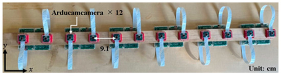 In the creation of a 3D point cloud from aerial photographs taken by an unmanned aerial vehicle, the overlap rate between images is generally set at 80% or more. In this study, 12 Arducam cameras were placed in a row on the gravel beach slope, positioned at 9.1 cm intervals above the channel and at a height of 34 cm from the channel’s top (Figure 5), ensuring a 90% overlap rate between images captured at the shoreline. Each camera was mounted on a wooden plate to stabilize its position and maintain consistent camera spacing.