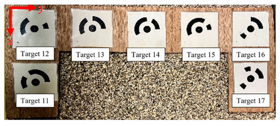 The experiment involved photographing the topography before, during, and after wave-making activities. During wave-making, 12 cameras installed above the channel captured images of the gravel beach at 30 s intervals, resulting in a total of 361 image sets. Before and after wave-making, the gravel beach in its drained condition was photographed by 12 cameras, with an additional four cameras repositioned offshore to capture a total of 16 images. Because markers could not be permanently installed on the offshore side, submerged during wave-making, two lasers were mounted to the top of the channel’s sidewall (Figure 7a). The center of the marker was aligned with the four intersection points of the linear lasers (Figure 7b). The position of the laser on the gravel beach surface was fixed, and markers were positioned at known points whose and coordinates had been previously measured by a total station. The -coordinate was measured by a laser rangefinder (Bosch GLM 50C) each time an image was captured, accommodating for topographic changes before and after wave creation.