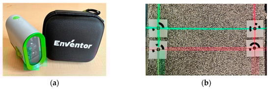 Laser and usage examples: (a) laser; (b) positioning of markers and laser.