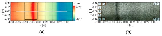 As a result of the experiment, a 3D model was constructed from simultaneously captured images using Metashape. From this model, the numerical surface model DSM (Figure 8a) and the orthomosaic image (Figure 8b) were extracted. The “Accuracy” setting in the “Photo Alignment” process was set to “High” to enhance the precision of the model constructed from the captured images. The accuracy of the DSM has been examined [12]. In this study, the measurement accuracy of the DSM was confirmed by comparison with the actual values measured using the total station. The results show that the maximum root mean squared error (RMSE) of the measured values is less than 0.6 cm in coordinates under the condition of “High” for the analysis accuracy of the “Photo Alignment” process.